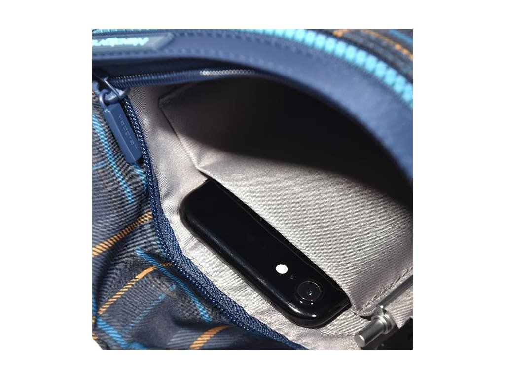 Luxusná dámska crossbody taška značky HADGREN v športovom prevedení v modrej farbe s károvaným vzorom. Vo vnútri tejto tašky nájdete vrecko uzatvárateľné zipsom. Na prednej strane tašky nájdete dve vrecká na zips, v jednom z nich nájdete otvorené vrecko na mobil a organizér na perá. Ramienko tašky je dĺžkovo nastaviteľné, jeho max. dĺžka je cca 130 cm.